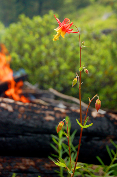 At this point, we planned on hiking no more than 4 more miles along the trail and to find a perfect place to camp along the way. I knew that if we reached the point where the John Day River met the Crane Creek Trail junction, we would have traveled those 4 miles. So from the Bigfoot Hilton, we set off along the trail to where the John Day River meets Crane Creek. The trail passed through a couple of meadows and the views opened up tremendously. The hiking trail diverged away from the John Day River at points and gained a little bit in elevation. As a result, the few hundred feet in elevation gain had opened up our view and made for some great opportunities to photograph the river and the rimrock canyon gorge. Fortunately at this time too, a day which had been mostly cloudy brightened up and this added light lit up the canyon and enhanced not only our views but warmed up our day too. My map noted that after approximately 3 miles, we would be in the vicinity of the Thornburg Mine. I have to say that although I kept looking for the mine, I am not sure I truly saw it. We did reach a spot along the trail where on the right side there were piles of old quarried rocks discarded into piles, and I believe at this point is where the mine may be located and possibly the entrance is obscured for safety reasons. A quarter of a mile after this point we reached a short couple of switchbacks along the trail and climbed in elevation a little bit before the trail quickly took us back down near the banks of the river. At this point, we figured we went nearly 4 miles and spotted a prime camp spot along the river. The area was flat and opened up with a few scattered trees, meadow grasses filled with Columbine flowers, and plenty of dry firewood around. It looked like the perfect place to spend the rest of our afternoon and evening.