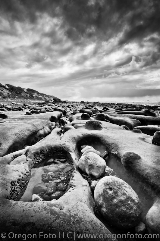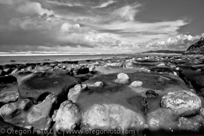Ona Beach is a worthy location for tide pool viewing, agate hunting, clamming, and beachcombing. However, its unique character makes it prime for photography. When the conditions are right and the rocky ocean floor is fully exposed, the view of this unusual landscape is immensely impressive. The beach is covered with geological curiosities that lend originality to a photograph. Visually, the scene covers a full spectrum of color from a wide dynamic tonal range of absolute black through pure white and includes the sweet spot of many grays in between. Several of the Ona Beach rock formations are covered in algae, which vary from dark amber to a bright canary yellow and many patches of fluorescent green from the various sea grasses. There are dark, shadowy igneous rocks that have been hidden by ocean depths, but also stark white formations that are exposed and weathered clean by the pounding waves and bleached by the unremitting sunlight.