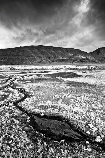 On a cloudy day, the face can look solid black and very menacing. Vegetation is sparse with dried grasses and occasional sage brush. The starting point for the hike is at the dirt parking area for Mickey Hot Springs. Face north and begin through the sage brush in the parking area. The climb is a moderate but steep hike and the route is easy to follow, and more or less, you make your own path. The total distance is 2.3 miles with 2,300 feet gain in elevation. At the summit, the reward is an incredible view of the Alvord Desert, the surrounding Sheepshead Range, and most of all, the eastern face of the Steens Mountain.